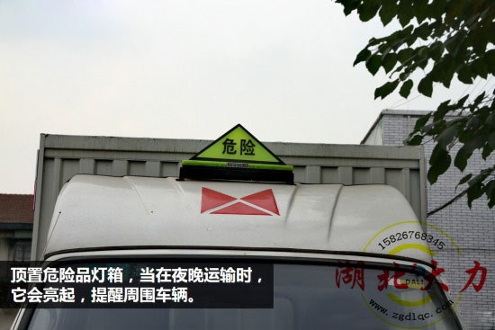 車頂導(dǎo)流罩上也加裝了危險(xiǎn)運(yùn)輸車的燈箱表示,以提醒周圍車輛,該車輛運(yùn)輸?shù)奈;锲,小心避讓?/span>
