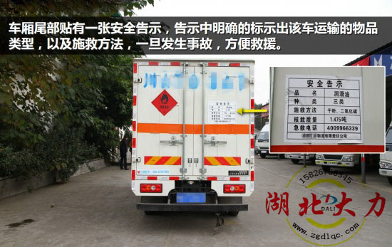 車廂尾部門板位置還貼有一張安全告示,告示中明確的標(biāo)示出該車運(yùn)輸?shù)奈锲奉愋,以及施救方法,如果車輛發(fā)生事故,這張告示將直接有效的告訴救援人員施救方法。