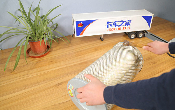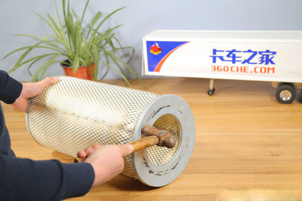 稱重之后接下來我們開始正式拆解,還是首先要將增加濾芯強度的金屬絲網拆掉,經過我們一番研究發(fā)現,這款濾芯的絲網質地非常柔軟,用手指輕輕一按就能夠發(fā)生形變,于是我們決定使用錘子先將連接端蓋處的絲網敲擊變形,再進行下一步的拆解。
