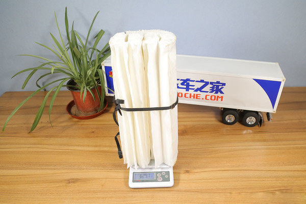 從拆解下來的端蓋上可以清晰的看到,固化的粘結劑經過敲擊之后,已經出現了大塊脫落。拆下來未經粘合的濾紙已經散開,我們利用細帶將濾紙捆綁在一起進行稱重,去掉細帶的重量,主芯濾紙的凈重為0.62千克。