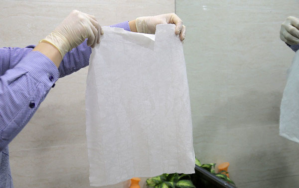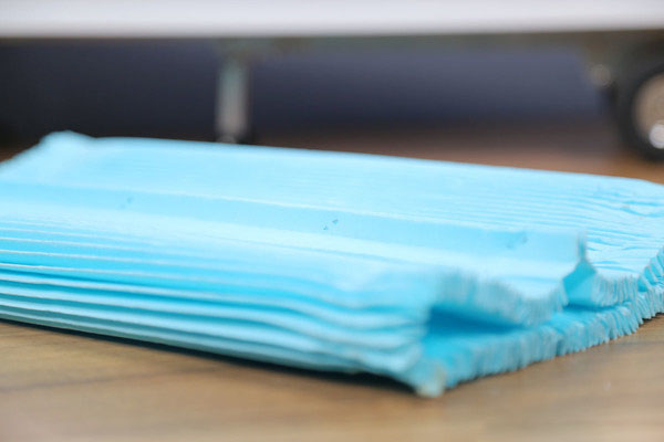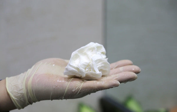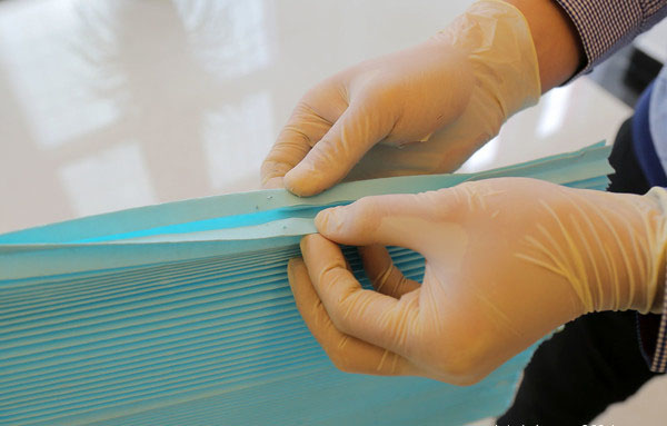 我們又剪下一塊主芯濾紙,將其放置在水槽內,遇水后濾紙已經完全被浸透了,并且從水槽中將濾紙?zhí)崞饋,在折線處已經出現了斷裂,毫無韌性可言。用手將浸濕的濾紙攥成一團,不僅有水從濾紙中析出,而且外形看上去就像被浸濕的普通紙巾一樣。所以空濾絕不能進入水分,否則會對濾紙造成損壞。
