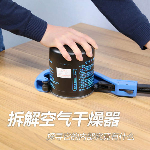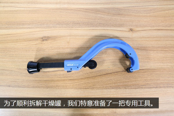 為了能順利的把干燥罐開膛破肚,我們特意準備了一個專用工具,這樣就能夠比較方便的把外殼切開了。這里給大家透露一下,因為它能切割最大140毫米的管狀物體,所以售價可不菲。