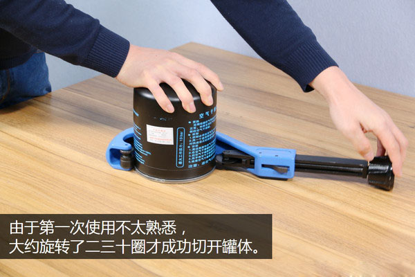 稱完重量就要開始切割了,首先把干燥罐放到切割工具上,調整好刀具的位置后開始旋轉切割,由于這個設備我也是第一次使用還不太熟練,大概旋轉了二三十圈才把罐體切開,但是好在切割過程還算是比較順利,切口也比較整齊,這一點我還是非常滿意的。