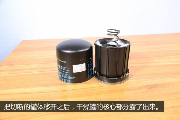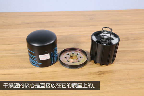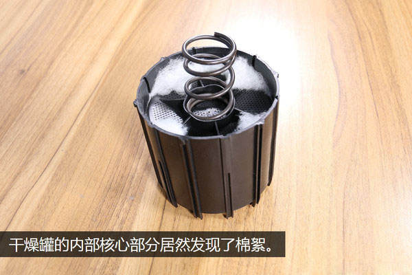 棉絮的究竟是干什么的咱先放一放,先把干燥罐的核心部分從底座上拆下來,拆的過程很簡單,輕輕一提它就下來了,因為核心是直接放在底座上的,并沒有任何的固定連接。經過這樣一番拆解之后,這個干燥罐分為了三個部分,核心、底座、罐體。
