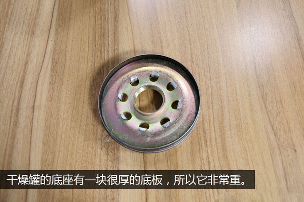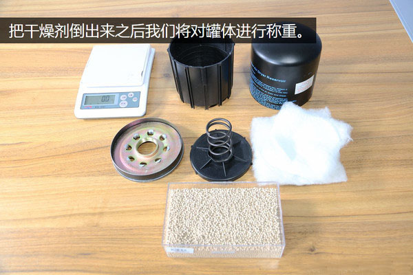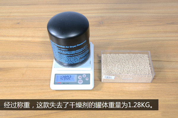 干燥劑的容量是衡量一款干燥罐質量的重要指標,所以我把除干燥劑本身之外的其它零部件全部組合到一起,重新了進行一次稱重,發(fā)現(xiàn)失去了干燥劑的罐體有1.28KG重,較拆解之前少了0.63KG,而這一部分的重量就是干燥劑本身的重量。