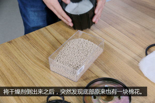 打開蓋子之后,這個干燥罐真正的核心部分,干燥劑終于展現(xiàn)在了我們的面前,用手抓了一些出來發(fā)現(xiàn)顆粒比較細小,太像某種豆子了,而我的同事則認為這玩意像貓屎。