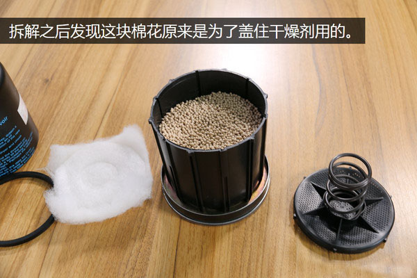 本來以為核心的壓蓋會很難拆下,但結果卻并不是這樣,因為用手拉住彈簧很輕松的就把蓋子拉了出來。打開蓋子之后那塊神秘的棉絮終于露出了真容,原來它是襯墊在壓蓋和干燥劑顆粒之間的,我猜測應該是起到壓緊干燥劑顆粒的作用,但是這樣真的有用嗎?