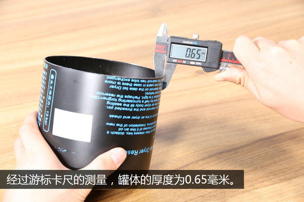最后用游標卡尺測量一下罐體的鐵皮厚度,經過測量得到的數(shù)據是0.65毫米,我個人認為這已經非常薄了,因為罐體的厚度直接決定了它的抗壓力性能,要知道干燥罐在工作的時候內部是有非常大的氣壓的。