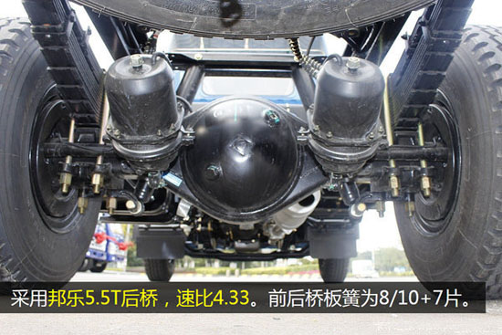 前后橋均采用了多片簧設計,提升車輛的承載性能。采用邦樂5.5噸級后橋,速比4.33。目前我國的輕卡產(chǎn)品普遍采用的是3.5噸級后橋與5噸級后橋,多利卡D6的5.5噸級算得上是載重量較高的后橋產(chǎn)品了。