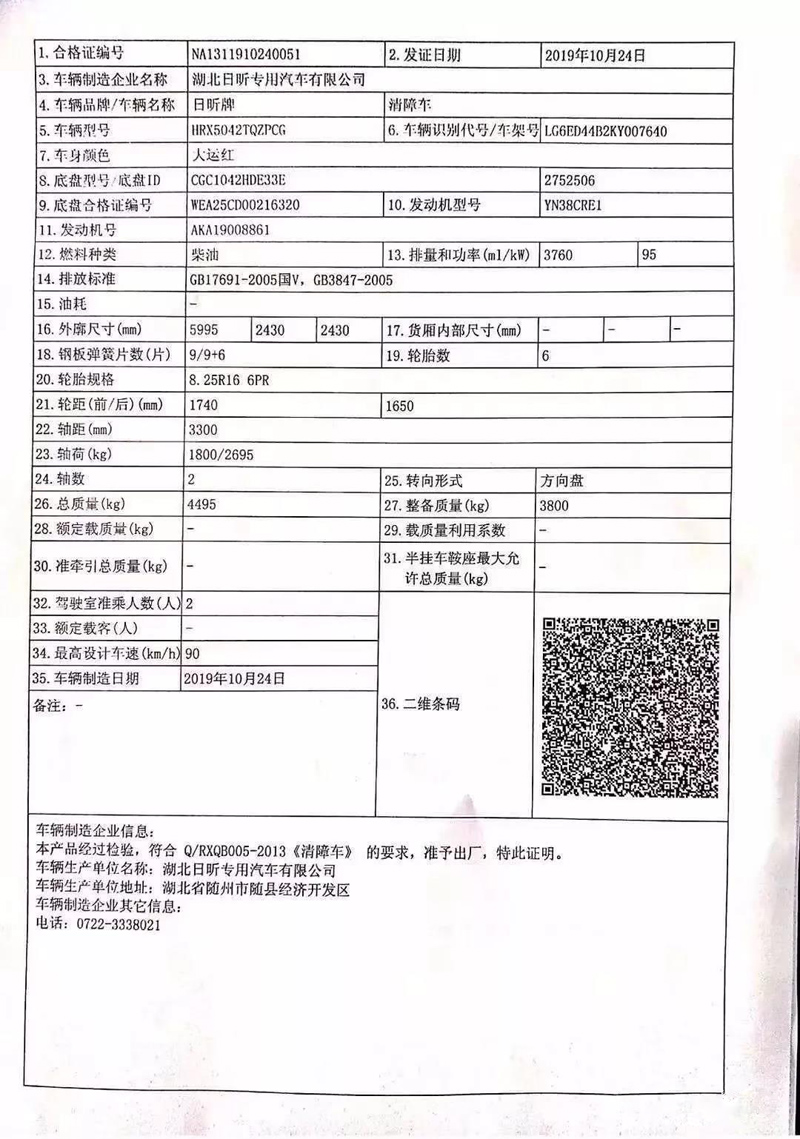 上圖是該車的合格證,圖中可以清楚的看到車輛名稱為清障車,整備質(zhì)量3800kg。