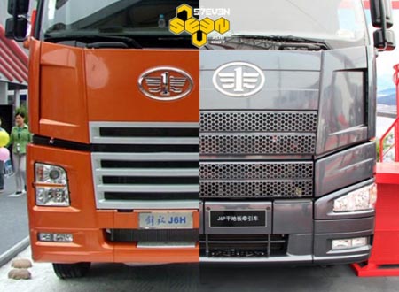從正面看,顯然J6H的駕駛室被抬高了之后,最上面一條進(jìn)氣格柵幾乎不起什么作用了,雖然他的進(jìn)氣格柵總面積與J6HC幾乎一樣大,但有效的進(jìn)氣面積會(huì)變小。從這個(gè)角度看,中間的補(bǔ)丁的確破壞了駕駛室的整體感。