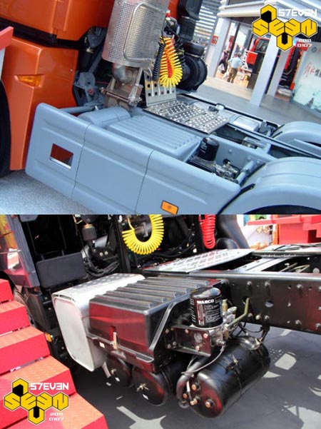 從后面看,J6HC的空濾雖然沒(méi)有布置在底盤(pán)里或者駕駛室下方,但總體結(jié)構(gòu)比較緊湊。但是J6H不但駕駛室打了補(bǔ)丁,進(jìn)氣管也打了補(bǔ)丁,硬生生的加長(zhǎng)了一截,看起來(lái)很怪異。另外膨脹水箱也沒(méi)有收納起來(lái),而是外露在駕駛室后圍上,讓人感覺(jué)十分遺憾。