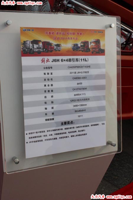 在2011年商務(wù)年會(huì)上,解放展示了作為即將在2011年量產(chǎn)的平地板J6,配置與2010年北京車(chē)展上的J6P平地板牽引車(chē)相同。而這次的命名,既不是“J6升級(jí)版”,也不是“J6P平地板”,而是回歸了他本來(lái)的名字“J6H”!