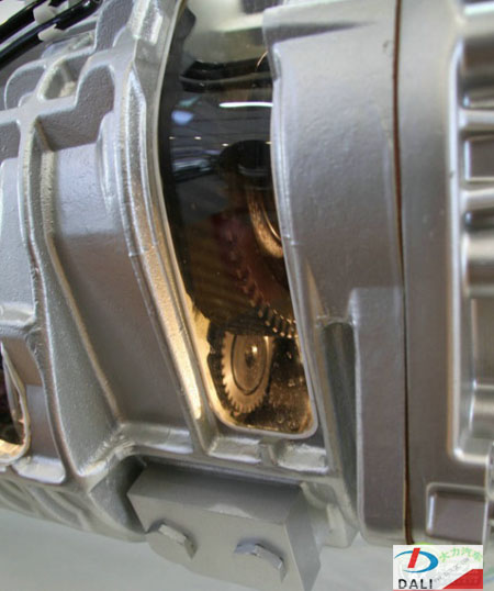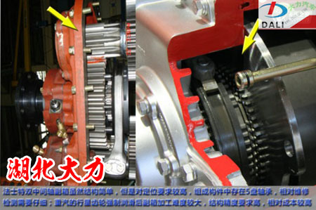 從結(jié)構(gòu)上看,法士特的雙中間軸變速箱基本上還是延續(xù)美國(guó)EATON的設(shè)計(jì)思路,但是在大扭矩變速箱上不裝強(qiáng)制潤(rùn)滑油泵,尤其長(zhǎng)時(shí)間爬坡以及高速重載下坡的情況下,在副箱上存在一定的不穩(wěn)定因素;可喜的是我們?cè)诒本┸?chē)展上看到了類(lèi)似油泵的設(shè)計(jì),只不過(guò)并沒(méi)有運(yùn)用在這次展出的AMT變速箱中,從驅(qū)動(dòng)形式上看,此種比較像后副箱驅(qū)動(dòng)類(lèi)型。