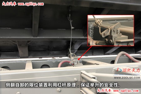 最后我們來看看側翻自卸的限位裝置,巧妙的利用了杠桿原理,當貨箱翻轉到指定位置后,帶動鋼絲繩帶動圖中杠桿原理,啟動限位裝置,保證了舉升的安全性。