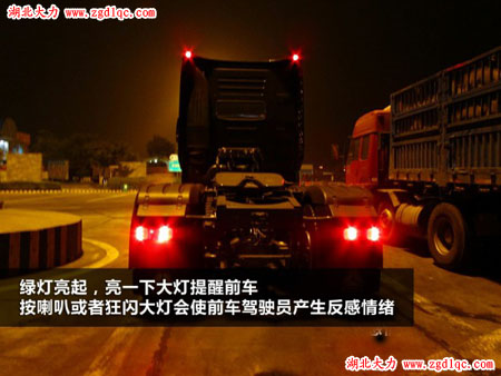 說(shuō)明:在路口等待紅綠燈,當(dāng)綠燈亮起,前車可能因?yàn)楦鞣N原因致使起步緩慢或者忘記起步,跟在后面的卡友通常會(huì)采用兩種辦法給前車提示——按喇叭或者閃大燈。按喇叭催促前車其實(shí)是一種很不文明的行為,通常會(huì)起到相反的作用,導(dǎo)致前車故意壓住后車;而狂閃大燈催促和按喇叭一樣,也會(huì)起到相反的作用。這是應(yīng)該先亮一下大燈,讓前車知曉,如果沒(méi)有動(dòng)靜就可以再亮一下提醒前車,到對(duì)方發(fā)現(xiàn)為止。