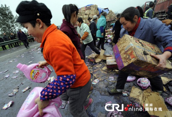 就在兩位司機(jī)等候高速公路執(zhí)法隊(duì)前來(lái)處理時(shí),高速路附近的村民發(fā)現(xiàn)后,紛紛涌入高速路上哄搶散落的貨物,氣得兩位受輕傷的司機(jī)大喊:“活搶人了……”