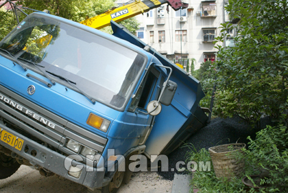 14時40分,記者趕到新村小學現(xiàn)場見到,一輛藍色瀝青車向左后側翻,車上的瀝青一半都撒在地上,被埋在里面的民工還沒有挖出來,一輛救援車試圖吊起側翻的瀝青車,但因起重力度不夠幾次未成,直到16時才將祝某的遺體拉出送到殯儀館。