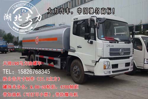 車輛配置 采用東風集團原裝底盤生產,排半可前翻駕駛室,大同6檔變速箱,4.5噸前橋9噸后橋,采用9.00-20尼龍?zhí)ヌゲ捎?50×80MM直通車架,配置康明斯190馬力發(fā)動機,發(fā)動機型號:B190 33. 豪華駕駛室,斷氣剎/排氣制動/動力轉向.配備標準加油機一臺,帶15米卷盤和槍,配置專用油泵,具有快速的進油或出油功能。隨車附帶2根罐體等長的油管,2個滅火器,1個爬梯,兩側及后保險杠,1根接地線。罐體最大容積17.5立方米(15噸柴油)。