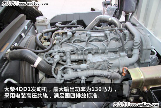 動力方面,發(fā)動機為采用道依茨技術(shù)的大柴4DD1發(fā)動機CA4DD1-13E4R,4缸16氣門,雙頂置凸輪軸設(shè)計,輸出功率為130馬力。動力強勁、節(jié)油性能突出。4DD1發(fā)動機采用電裝電控高壓共軌系統(tǒng),EGR后處理系統(tǒng)帶POC+DOC顆粒捕捉器,滿足國四排放標(biāo)準(zhǔn)。