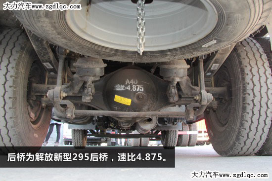 輕卡后橋為解放新型研發(fā)295后橋,速比4.875。前橋為3片簧結(jié)構(gòu),后橋彈簧板片數(shù)為3+4。從在車輛后部觀察到這款輕卡配備了橫向穩(wěn)定桿,穩(wěn)定性能更好。