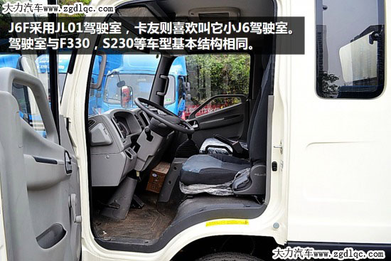 J6F采用JL01駕駛室,卡友則喜歡叫它小J6駕駛室。駕駛室與F330,S230等車型基本結(jié)構(gòu)相同。實拍車型的駕駛室寬度為1895mm,用戶可根據(jù)自己需要選裝有天窗的駕駛室。