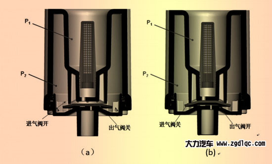 當(dāng)空氣干燥器的卸荷閥打開后,將使空壓機(jī)到干燥器之間的氣壓降低,排氣閥膜片打開,如圖(b),油水混合物及雜質(zhì)通過排氣閥排入大氣或流入外置收集筒中,當(dāng)油水分離器收集器(p2)中的壓力降低到一定水平后,膜片關(guān)閉。